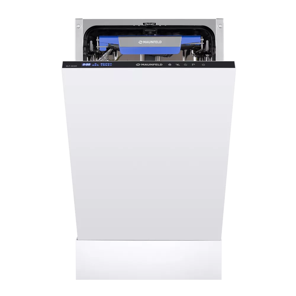 Узкая встраиваемая посудомоечная машина MAUNFELD MLP-08IMR бережно экономит место на кухне: корпус шириной 45 см легко вписывается в стандартный шкаф, а фасад остается аккуратным и цельным.