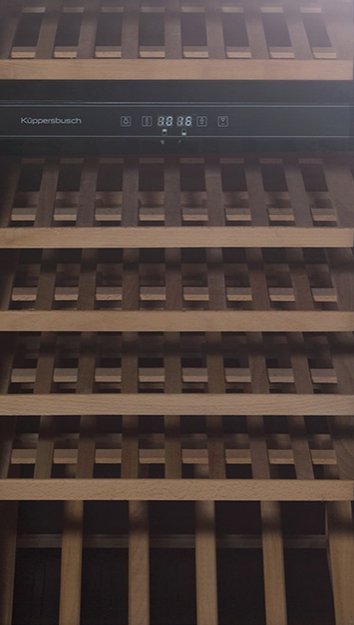 Встраиваемый винный шкаф Kuppersbusch FWK 4800.0 S2 из премиальной серии K.8 — это вместительное и технологичное решение для хранения и созревания вин, сочетающее элегантный дизайн и передовые технологии. Модель выполнена в черном стекле с дизайном Black Chrome (черный хром), что придает ей сдержанный и современный вид. Вместимость составляет 79 бутылок, размещенных на 9 деревянных полках. Электронная система управления с цифровым дисплеем и нажимными кнопками обеспечивает точный контроль температуры в диапазоне 5–18 °C в двух независимых отделениях. Инновационная система охлаждения с динамической циркуляцией воздуха гарантирует равномерное распределение температуры и влажности по всему объему. Резервуар для воды обеспечивает дополнительное увлажнение, создавая идеальные условия для длительного хранения вин. LED-освещение деликатно подсвечивает коллекцию без нагрева. Шкаф оснащен полным набором сигнализаций: звуковой сигнал, световая индикация аварии, индикация температуры внутри и снаружи. Изменяемая навеска двери (угол открывания 90°) позволяет адаптировать установку под планировку. Низкий уровень шума 39 дБ обеспечивает комфортную эксплуатацию . Производство — бренд из Германии.